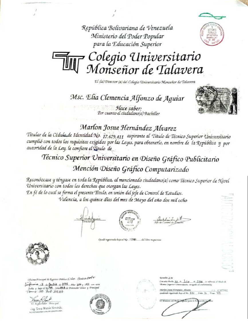 Colegio Universitario Monseñor de Talavera · Venezuela · 2008 Título base en diseño gráfico con mención en Diseño Computarizado. Me permitió dominar los fundamentos de la comunicación visual, el diseño publicitario y el uso de herramientas digitales para la creación de piezas gráficas profesionales.